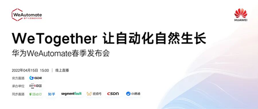 4月15日,由华为技术有限公司主办、RPA中国承办的「华为WeAutomate春季发布会」将在线上举行,本次发布会以“WeTogether让自动化自然生长”为主题,希望通过更完善的产品功能和体验赋能客户、伙伴,促进自动化理念在更多组织里开花结果。