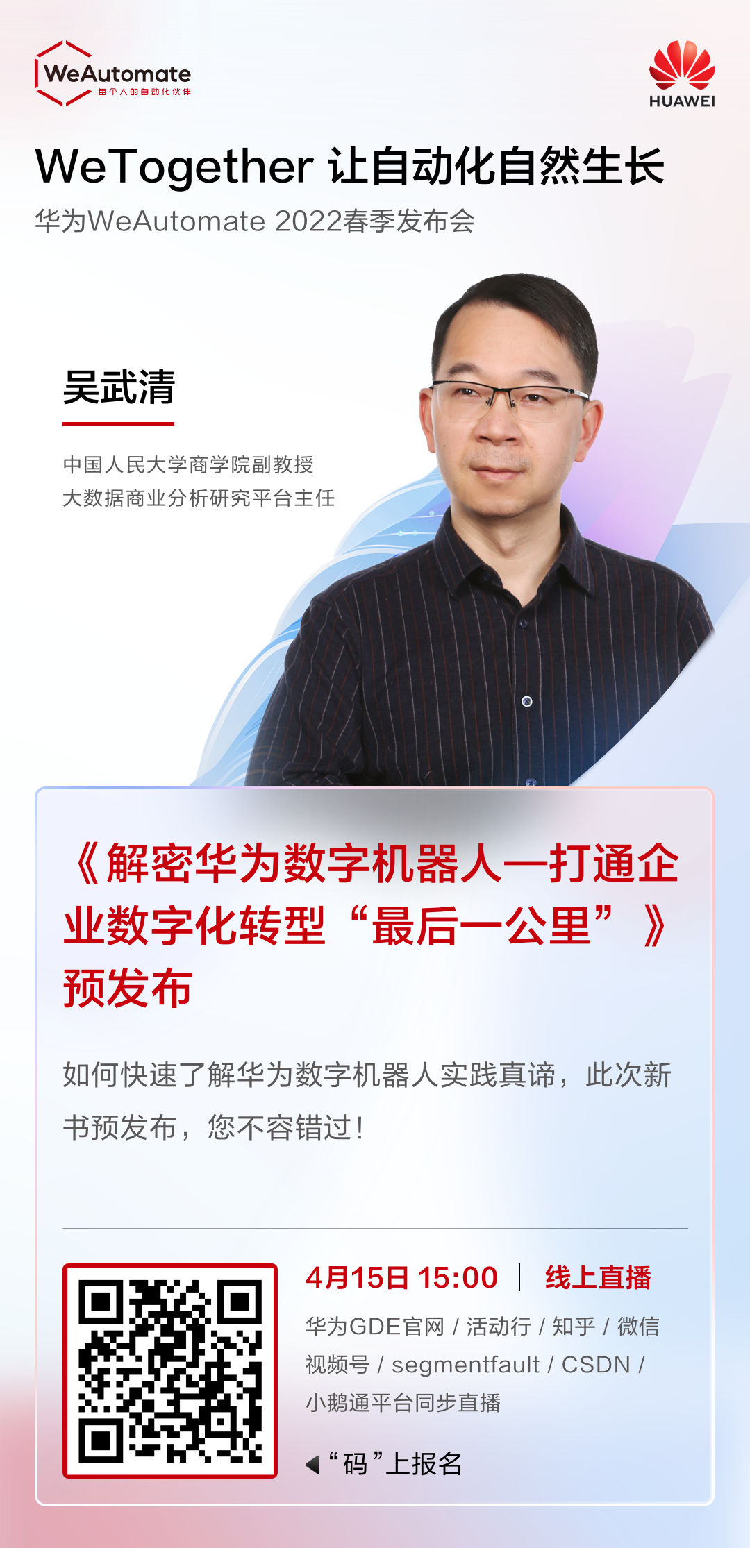 欢迎参加4月15日「华为WeAutomate春季发布会」,关注中国人民大学商学院副教授吴武清精彩分享,收获更多关于超级自动化前沿信息。