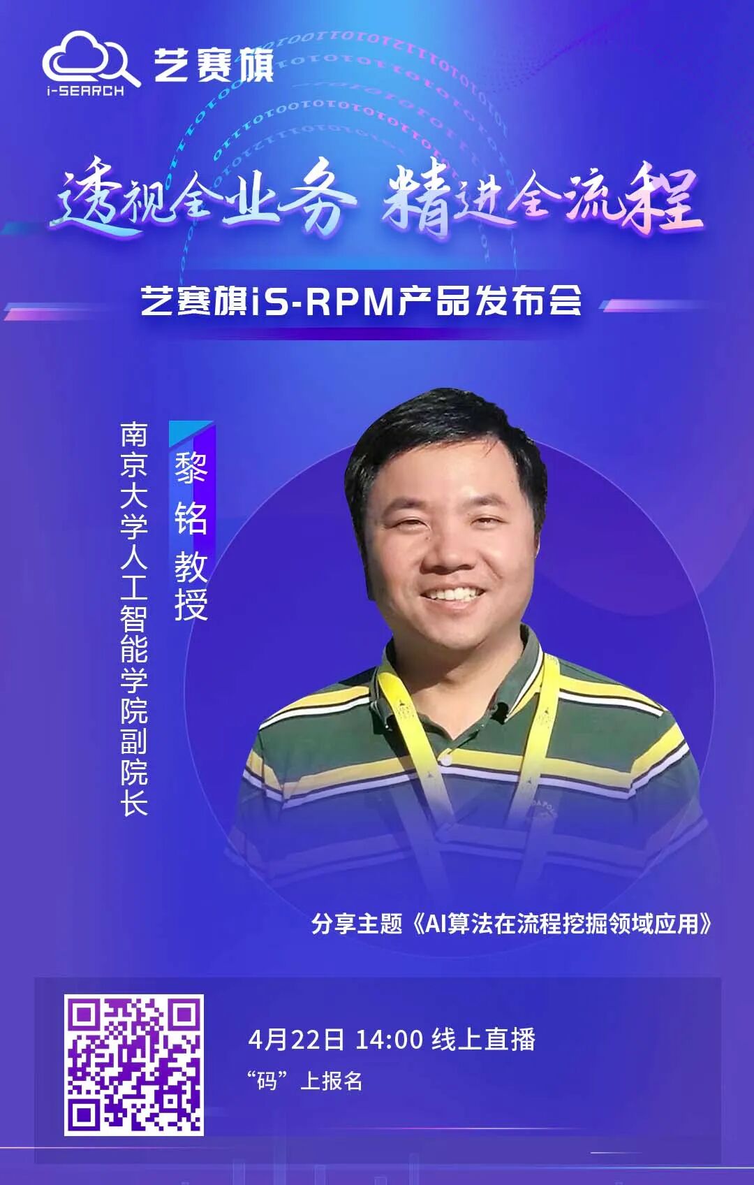 欢迎参加4月22日「透视全业务 精进全流程-艺赛旗iS-RPM产品发布会」,关注南京大学人工智能学院副院长黎铭的精彩分享,收获更多关于流程挖掘的前沿信息。