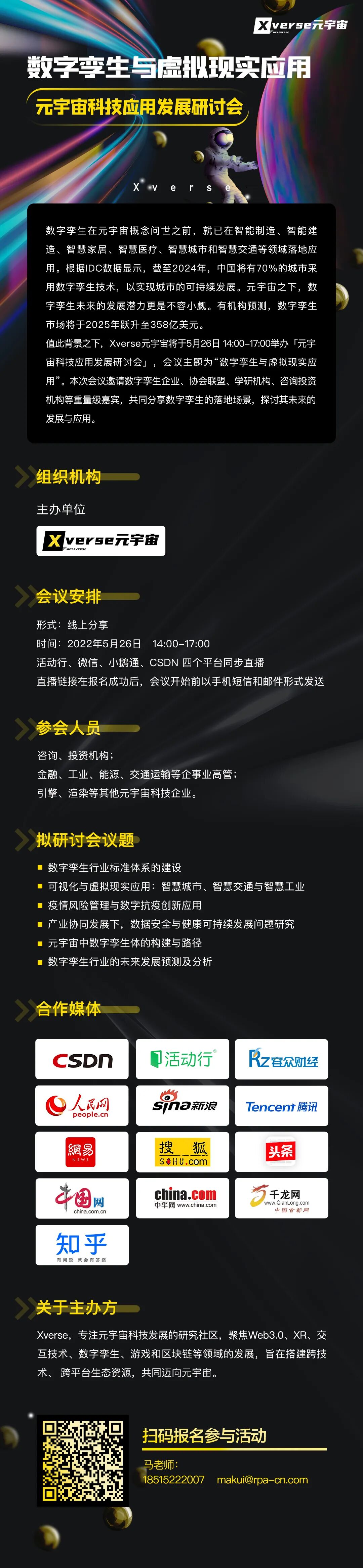 值此背景之下,Xverse元宇宙将于5月26日 14:00-17:00举办「元宇宙科技应用发展研讨会」。本次研讨会邀请数字孪生企业、协会联盟、学研机构、咨询投资机构等重量级嘉宾,共同分享数字孪生的落地场景,探讨其未来的发展与应用。