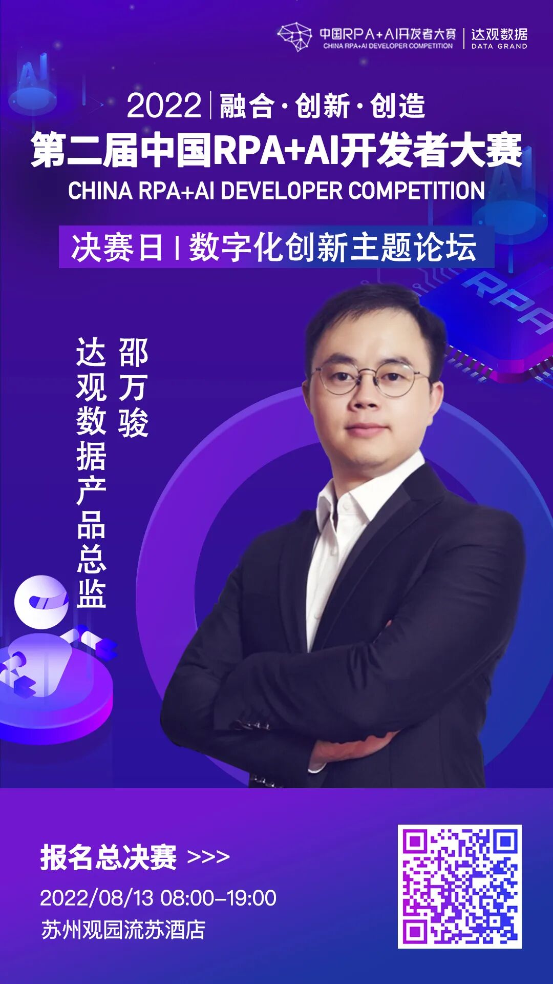欢迎参加8月13日「第二届中国RPA+AI开发者大赛」-“数字化创新主题论坛”,关注达观数据产品总监邵万骏的精彩分享,收获更多关于RPA、AI等创新技术应用的前沿信息。