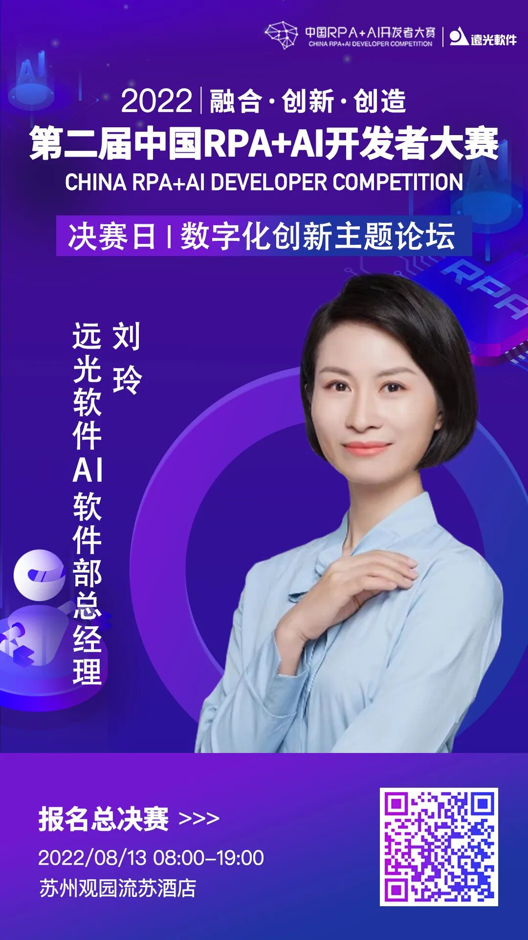 欢迎参加8月13日「第二届中国RPA+AI开发者大赛」-“数字化创新主题论坛”,关注远光软件AI软件部总经理刘玲的精彩分享,收获更多关于RPA、AI等创新技术应用的前沿信息。