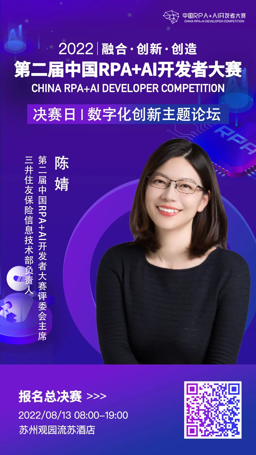 8月13日08:00-19:00,「第二届中国RPA+AI开发者大赛」将在苏州观园流苏酒店进行总决赛!大赛评委会主席、三井住友保险信息技术部负责人陈婧,将代表评委会为大赛致辞并出席颁奖典礼。