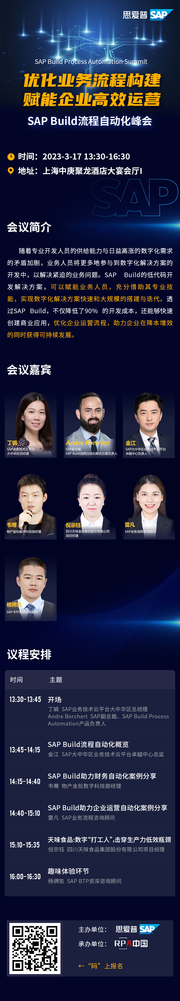 2023年3月17日,由思爱普SAP主办、RPA中国承办的「优化业务流程构建,赋能企业高效运营」SAP Build流程自动化峰会,将在上海中庚聚龙酒店盛大启幕。