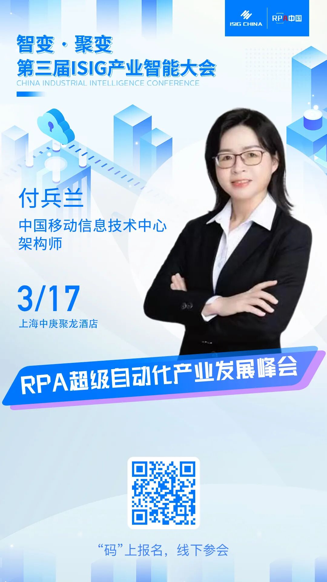 来自中国移动信息技术中心的架构师付兵兰女士,将受邀在本次「ISIG中国产业智能大会」上与大家见面,并在3月17日的“RPA超级自动化产业发展峰会”上与大家一同分享RPA超自动化技术在中国移动的应用实践。