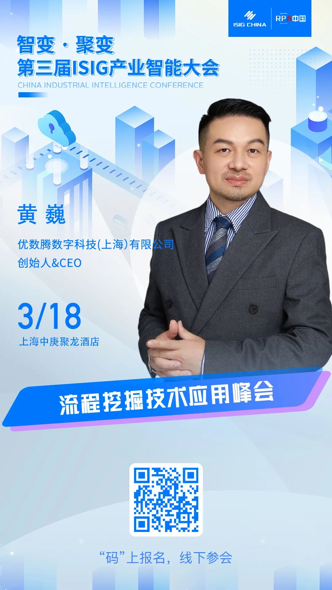 优数腾数字科技(上海)有限公司创始人&CEO黄巍先生,将受邀在本次「ISIG中国产业智能大会」上与大家见面,并在3月18日的“流程挖掘技术应用峰会”上与大家一同分享优数腾在流程挖掘领域的技术探索与实践。
