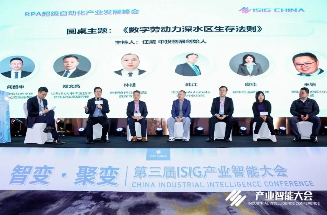 最后,在圆桌论坛环节,由中投创展创始人任威担任主持人,邀请到SAP大中华区、行业和客户团队阎韶华、UiPath大中华区技术合作伙伴高级经理郑文亮、金智维行业研究院资深专家林旭、华为WeAutomate教育行业总监韩江、普华永道高级经理虞佳、德勤流程挖掘中心总监王韬围绕主题《数字劳动力深水区生存法则》展开对话。7位嘉宾从概念内涵、商业生态、技术发展及行业标准等不同角度展开陈述,观点深刻的同时极具前瞻性,让在座观众耳目一新。