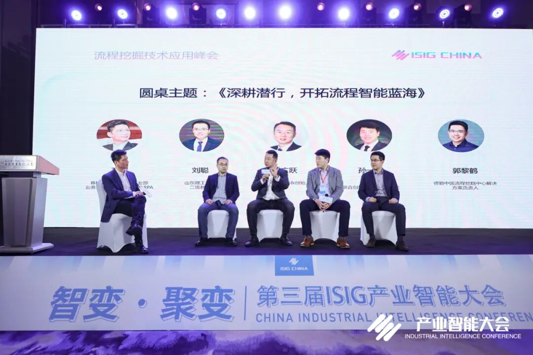 最后,在圆桌论坛环节,由IBM大中华区科技事业部业务自动化流程挖掘及RPA高级产品经理孙震担任主持人,与山东理工大学刘聪教授、凡得科技CEO 海广跃、评科技联合创始人&首席科学家孙一鸣博士、德勤中国流程挖掘中心解决方案负责人 郭黎鹤,共同围绕主题《深耕潜行,开拓流程智能蓝海》 展开对话。5位嘉宾从概念内涵、商业生态、技术发展及行业标准等不同角度展开陈述,观点深刻的同时极具前瞻性,让在座观众耳目一新。