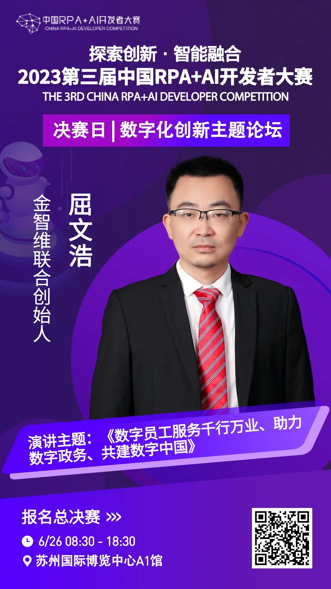 金智维联合创始人屈文浩作为特邀嘉宾,将出席「第三届中国RPA+AI开发者大赛」,并在当日的「数字化创新主题论坛」上以《数字员工服务千行万业、助力数字政务、共建数字中国》为题做精彩演讲。