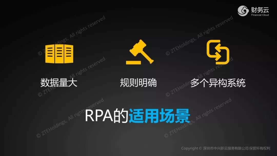 RPA财务机器人在财务审核、报税、收付领域之外,其实在很多的地方都可以做,我们建议是:第一,要分清你的规模、你的量够不够大。第二点,在具体用RPA的时候要分析可行性、要分析产出比。