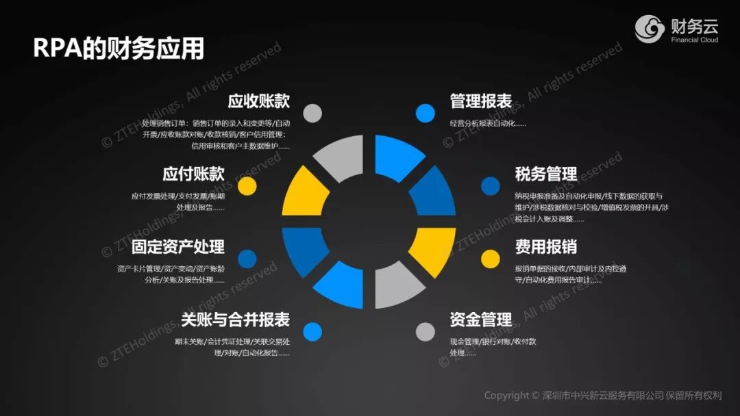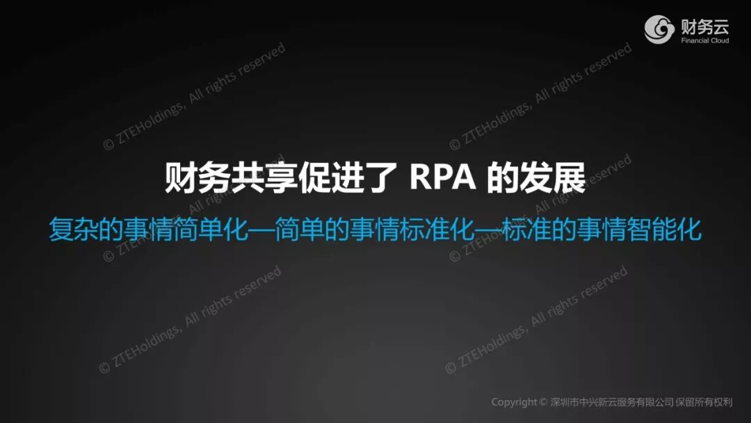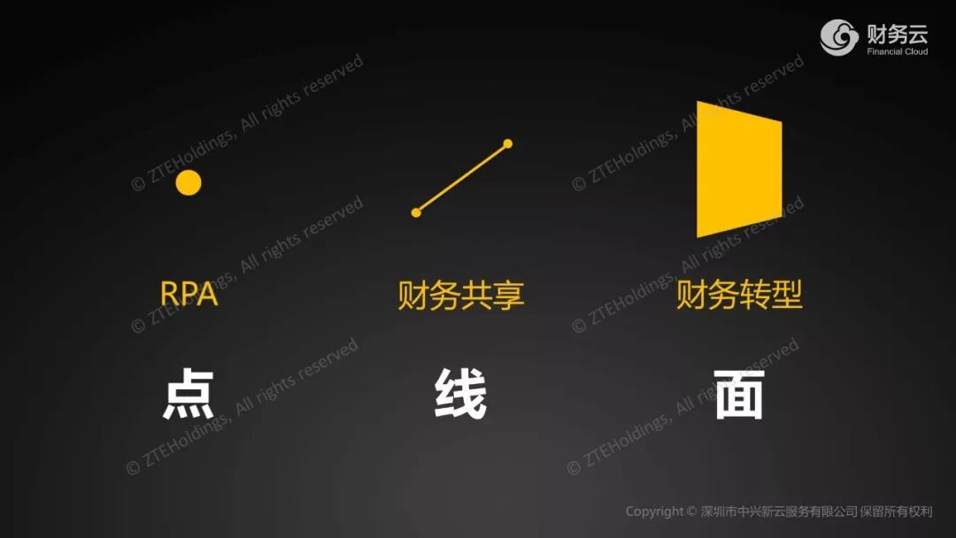 RPA是点,共享服务中心是线,那么更高级别的是什么呢?是财务转型再造。实现共享服务、业务财务、战略财务对于公司经营和战略的全面支撑,只有点、线、面相结合,财务部门才能发挥应有的价值。