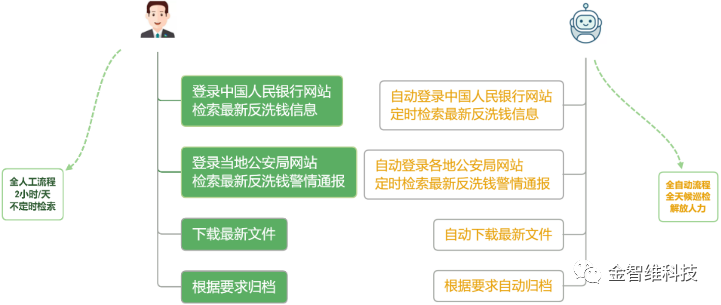 上线RPA机器人之前,该岗位工作人员需要定时去人民银行、公安部门网站等第三方网站下载反洗钱相最新法律法规及警情通报等信息。