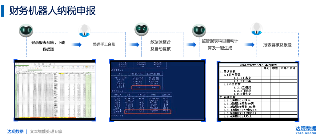 财务机器人的核心关键技术是基于达观智能RPA的技术平台,融合达观自研的人工智能组件的加持,其包括OCR(Optical Character Recognition,光学字符识别)、NLP(Natural Language Processing、自然语言理解)、CV(Computer Vision,计算机视觉技术) 等人工智能组件模块。如此强大的功能是如何应用的呢?