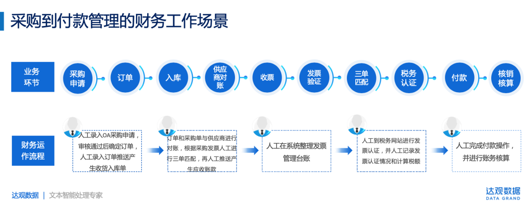 针对以上的财务运作流程,基于AI+RPA技术的财务机器人能够很好的实现从采购合同,收货入库,供应商对账、发票管理、三单匹配、到付款核销,VAT 发票网上集中认证和纳税申报的全流程智能自动化。