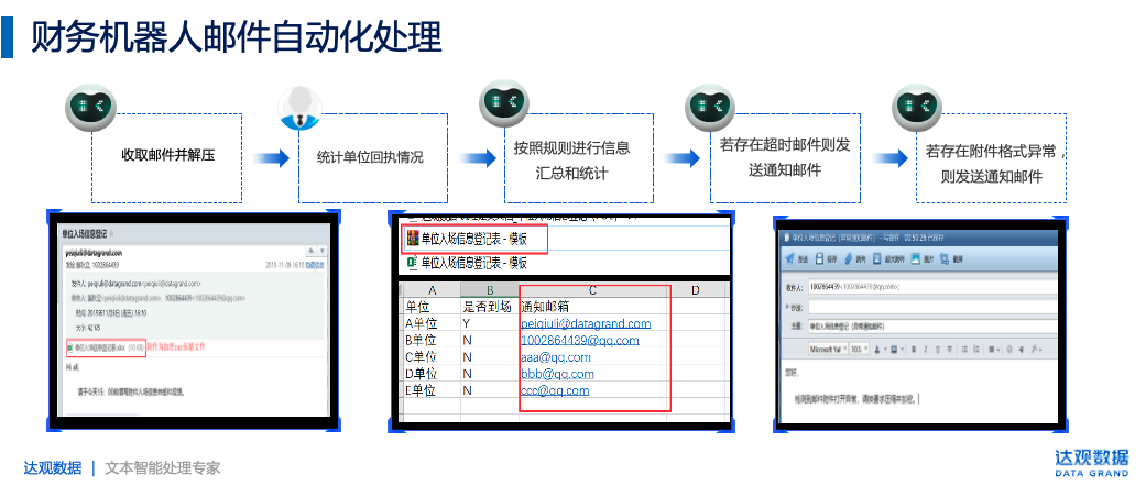 会计部门业务人员每月需多次向相关单位发送账龄信息收集通知邮件,并在指定时间内收取单位回执邮件,对附件数据进行汇总。通过财务机器人根据邮件主题关键字收取指定邮件,统计已回复邮件单位及超时未回复单位,并根据业务需求汇总各单位回执EXCEL文件数据,大幅提升工作效率,每封邮件处理时间由3分钟缩短至0.5分钟。