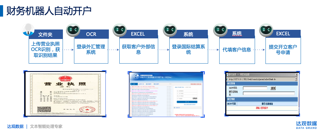 在进行收款核销的流程处理前,在某些业务中需要为用户到外汇管理系统中自动开户,通过财务机器人可以实现开户文件的自动识别、字段读取,财务机器人自动登录相关网站进行信息填入,并提交开户申请。整个流程一气呵成,完美解决人工录入繁琐问题,提高信息办理效果和准确率。