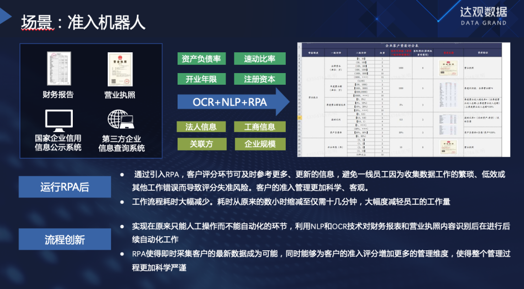 客户准入审核时往往需要客户提交财务报表、营业执照等信息,再根据预制公式、审核规则来判断是否允许准入,并决定其服务价格、信用额度等。此过程需要耗费大量专业人力来收集信息,还需进行跨多个系统操作查询工商信息、法人等信息,过程耗时耗力且难以及时更新。该问题在零售、服务、快消等行业十分显著。