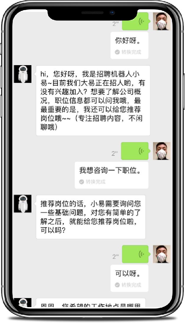 求职者在申请职位前可向 AI 机器人咨询企业状况和职位信息,机器人也可以反向了解求职者的个人情况并智能推荐合适的职位。候选人提交职位申请后,还可以随时问询简历处理进展、调整面试时间等,极大提升候选人应聘体验。