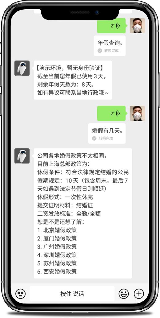 每当企业校招季结束,大批新员工入职,各种事务性咨询让 HR 应接不暇。大易提供的员工服务机器人可以解答新员工关于公司政策、流程制度、个人薪酬明细、假勤情况等多维度问题。员工也可直接向机器人发起请假、审批等流程。7×24 小时服务,随时响应,自然语言回答,减轻 HR 海量咨询负担的同时确保员工体验。