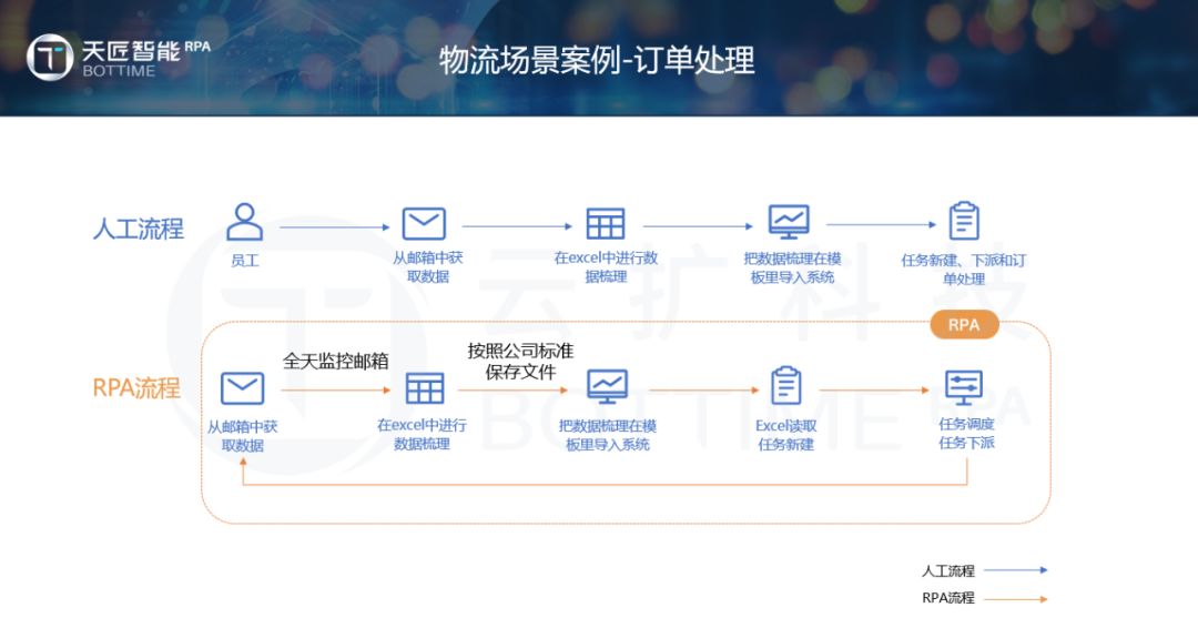 实施云扩RPA后:RPA软件机器人能够自动从邮箱中获取数据模板,对Excel中的数据进行梳理后将数据模板导入平台系统,并且自动进行任务的新建、下派及订单处理。