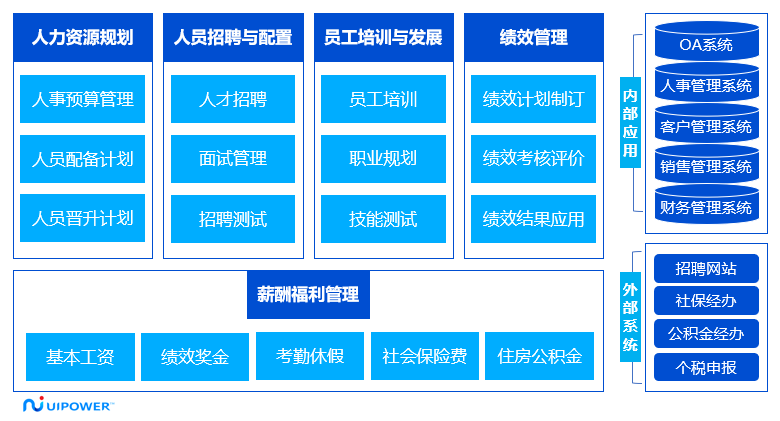 在很多企业,人力资源业务模块都会涉及内部或外部不同的系统应用,通常,同一批人力资源管理信息需要在不同的系统中重复输入。人力资源管理业务模块及可能涉及的内部应用系统和外部系统,我们用以下这张框架图来简要说明: