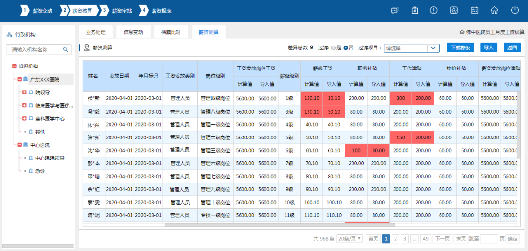 由于医院的薪资核算与绩效核算涉及到引用员工以及科室的多个数据项,且需要考虑各种数据项的综合计划情况,例如个人职称、院龄的不同,涉及到的相关津贴、补助项级别也不同;门诊次数、门诊基本奖金与个人岗位级别挂钩等。