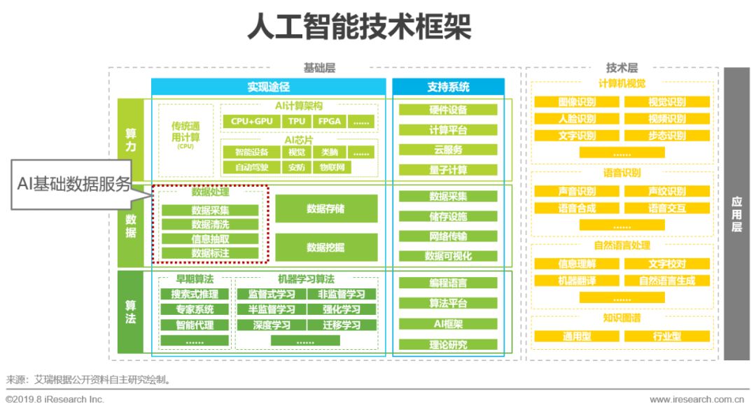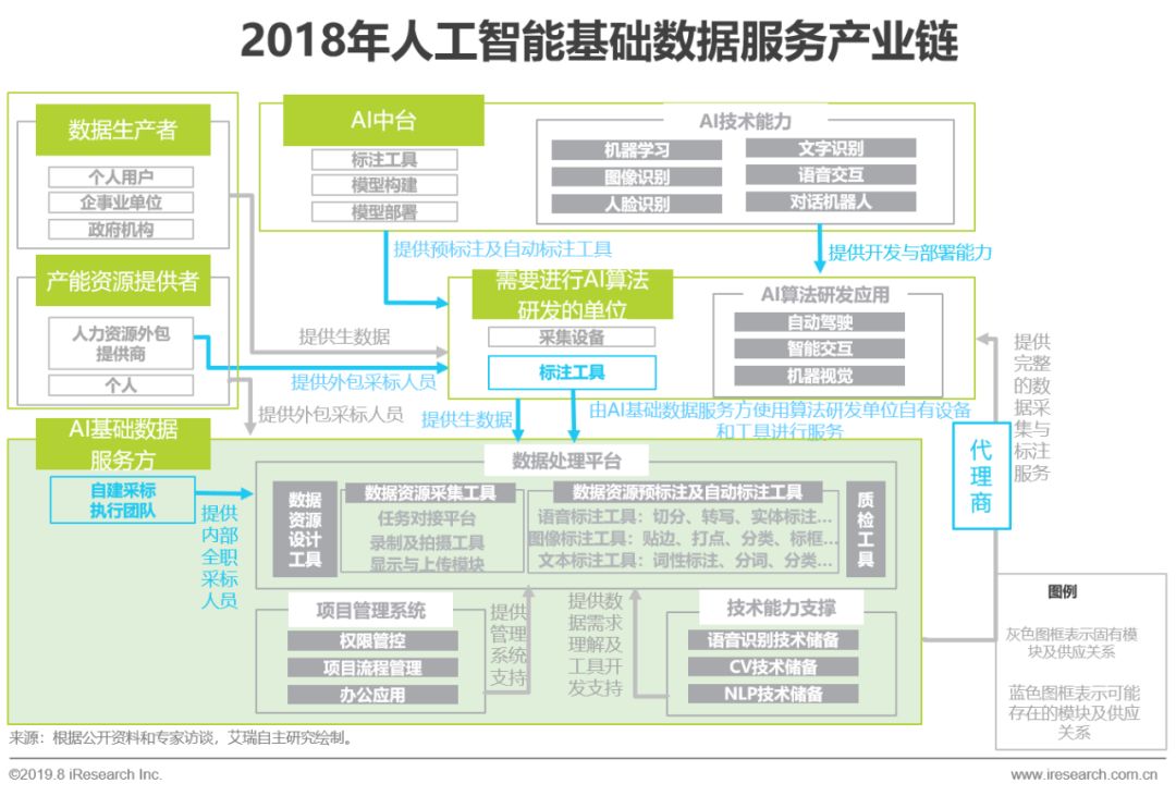 人工智能基础数据服务指为AI算法训练及优化提供的数据采集、清洗、信息抽取、标注等服务,以采集和标注为主。 人工智能概念爆发伊始,算法、算力、数据就作为最重要的三要素被人们乐道,进入落地阶段,智能交互、人脸识别、无人驾驶等应用成为了最大的热门,AI公司开始比拼技术与产业的结合能力,而数据作为AI算法的“燃料”,是实现这一能力的必要条件,因此,为机器学习算法训练、优化提供数据采集、标注等服务的人工智能基础数据服务成为了这一人工智能热潮中必不可少的一环。 如果说计算机工程师是AI的老师,那基础数据服务就是老师手中的教材。