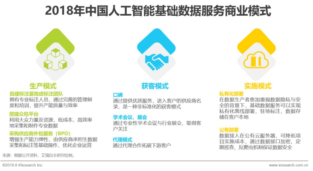 人工智能基础数据服务行业是典型的To B型业务,商业模式较为稳定。 在生产方面,主要通过自建标注基地或标注团队、搭建众包平台、采购供应商外包服务(BPO)等模式实现生产运营,大多企业主要采取众包与外包模式,百度数据众包、倍赛等企业自建标注基地或全职标注团队,对于培训较高素质工作人员、完善团队管理有积极意义; 在获客方面,主要通过口碑传播、学术会议与展会及代理渠道等模式进入市场,对销售人员熟悉市场趋势、客户需求的要求较高; 在实施交付方面,有私有化部署和公有部署两类,能够较为灵活地应对客户对数据安全、交付周期与成本的个性化需求。