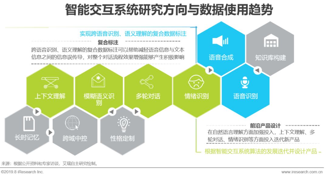目前企业在智能交互系统的建设中,对单纯的语音识别或合成方面技术能力相对较完善,而在上下文理解、多轮对话、情绪识别、模糊语义识别、意图判断等方面的研发痛点更强,根据智能交互系统算法的发展,迭代并设计符合算法需求的NLP数据产品,有助于从数据层面推动智能交互系统的发展。 特别的,对话系统的效果对标注数据的质量和规模依赖性很强,但目前受标注数据和模型能力的双重制约,对话流程还无法对语音、语义整个交互流程打通,而实现跨语音识别、语义理解的复合数据标注可以帮助减轻语音信息与文本信息之间的信息误传导,对整个对话流程效果增强能够产生积极影响,将增加智能交互基础数据服务探索的可能性。
