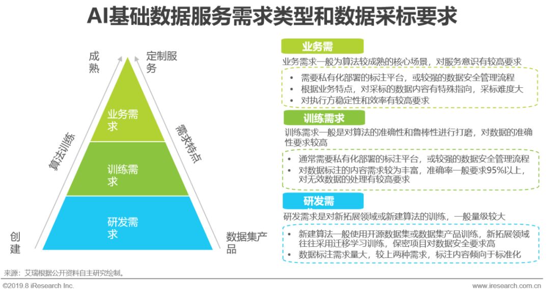 企业应用人工智能算法要经历研发、训练和落地三个阶段,不同阶段对于AI基础数据服务也有差异化需求。 研发需求是新算法研发拓展时产生的数据需求,一般量级较大,初期多采用标准数据集产品训练,中后期则需要专业的数据定制采标服务; 训练需求是通过标注数据对已有算法的准确率、鲁棒性等能力进行优化,是市场中的主要需求,以定制化服务为主,对算法的准确性有较高要求; 落地场景的业务需求中算法较为成熟,涉及的数据采集和标注更贴合具体业务,如飞机保养中的涂料识别数据等,对于标注能力和供应商主动提出优化意见的服务意识有较强要求。