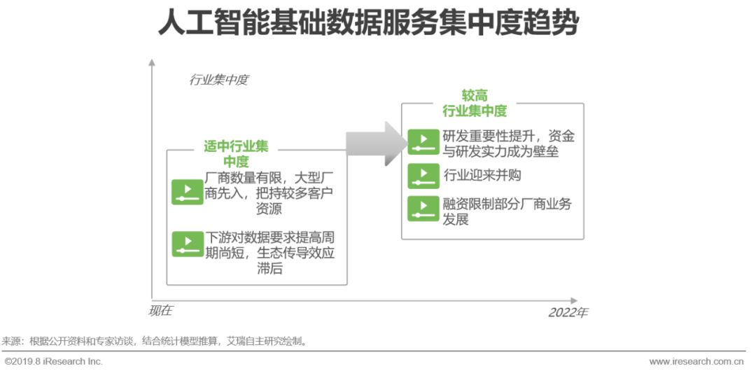 伴随国内人工智能热潮爆发,大量的AI公司拿到融资,为了不断提高算法精度,数据采标需求也空前爆发,一度催生了行业的繁荣。 但早期的AI基础数据服务门槛较低,玩家鱼龙混杂,使行业标准模糊、服务质量参差不齐。 随着竞争加快,AI公司对训练数据的质量要求也不断提高,并且当产业落地成为主旋律,需求方对垂直场景的定制化数据采标需求成为主流,众多小型AI基础数据服务公司从数据质量和采标能力上达不到要求,或被淘汰,或依附大平台,行业格局逐渐清晰,头部公司实力逐渐凸显。随着算法需求越来越旺盛,目前机器辅助标注、人工主要标注的手段需要改进提升,增强数据处理平台持续学习和自学习能力,增加机器能够标注维度、提升机器处理数据的精度,由机器承担主要标注工作将成为下一阶段的行业重心。 未来,越来越多的长尾、小概率事件所产生的数据需求增强,人机协作标注的模式性价比不足,机器模拟或机器生成数据会是解决这一问题的良好途径,及早研发相应技术也将成为AI基础数据服务商未来的护城河。