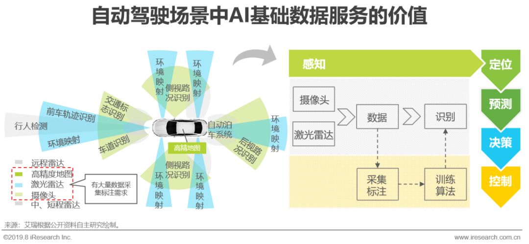 L3级别以上的自动驾驶系统主要有感知、定位、预测、决策和控制五部分,其对于计算机视觉技术的需求度远高于ADAS,系统需要对雷达、摄像头等传感器采集的点云和图像数据进行抽取、处理和融合,构建车辆行驶环境,为预测和决策做依据,这对于算法的准确性和实时性有极大考验。 目前自动驾驶的视觉技术主要应用有监督的深度学习,是基于已知变量和因变量推导函数关系的算法模型,需要大量的标注数据对模型进行训练和调优。 在世界级无人驾驶大赛中,主办方往往提供近亿张图片、数十万张标注图片供参赛团队训练使用; 在路测或真实道路驾驶时,如人车混杂、分布稠密、行为多变等复杂环境问题更需要海量的真实路况数据不断对算法进行优化,才能保障无人驾驶车辆正常可用。 如今国内自动驾驶飞速发展,AI公司、科技公司、高精地图厂商、车厂等参与者众多,该领域的数据采集和标注需求已经成为AI基础数据服务的主要项目之一,且自动驾驶算法应用仍待优化,数据需求缺口仍在,市场远未饱和。