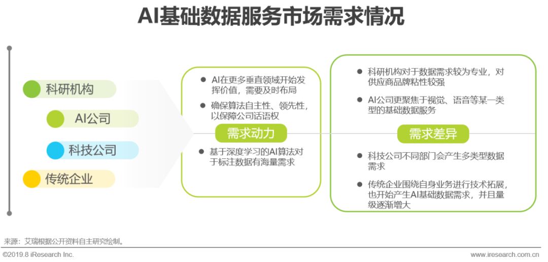 从需求方来看,AI公司和科技公司占主要份额,AI公司更聚焦于视觉、语音等某一类型的基础数据服务,而科技公司结合集团优势,向人工智能整体发力,不同部门会产生多类型数据需求,科研机构需求占比较小。此外传统意义上的行业企业,如汽车厂商、手机品牌商、安防厂商等传统企业围绕自身业务进行技术拓展,也开始产生AI基础数据需求,并且量级逐渐增大,未来将释放更多市场空间。