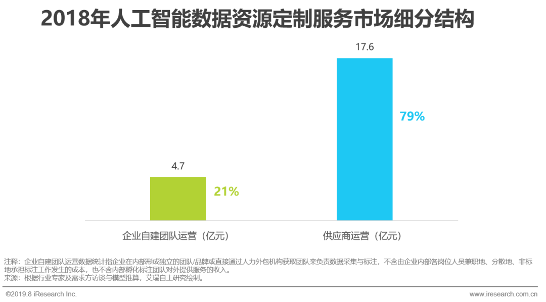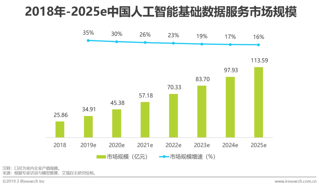 2018年中国人工智能基础数据服务市场规模为25.86亿元,其中数据资源定制服务占比86%,预计2025年市场规模将突破113亿元。市场供给方主要由人工智能基础数据服务供应商和算法研发单位自建或直接获取外包标注团队的形式组成,其中供应商是行业主要支撑力量。