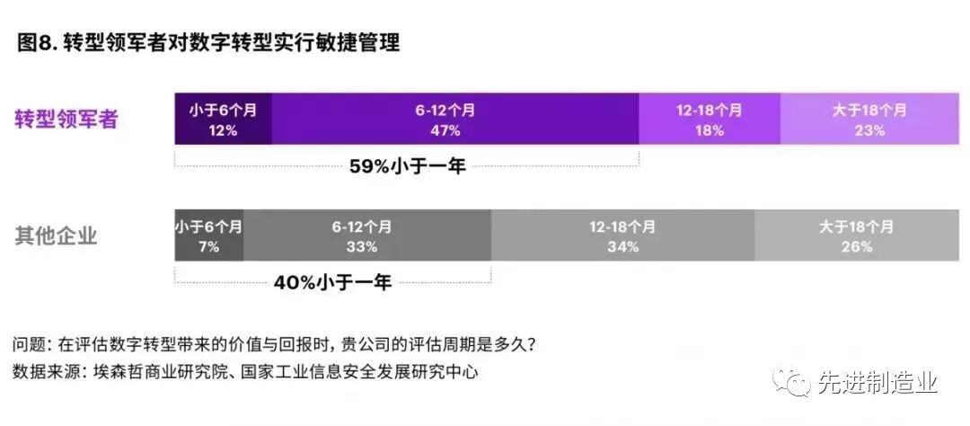 在正确的战略方向下,领军者同时强调动态调整,允许试错,快速迭代,因而它们对数字转型效果的评估周期更短:12%的领军者评估周期小于6个月,59%的领军者小于一年;而其他企业的评估节奏则相对低频。