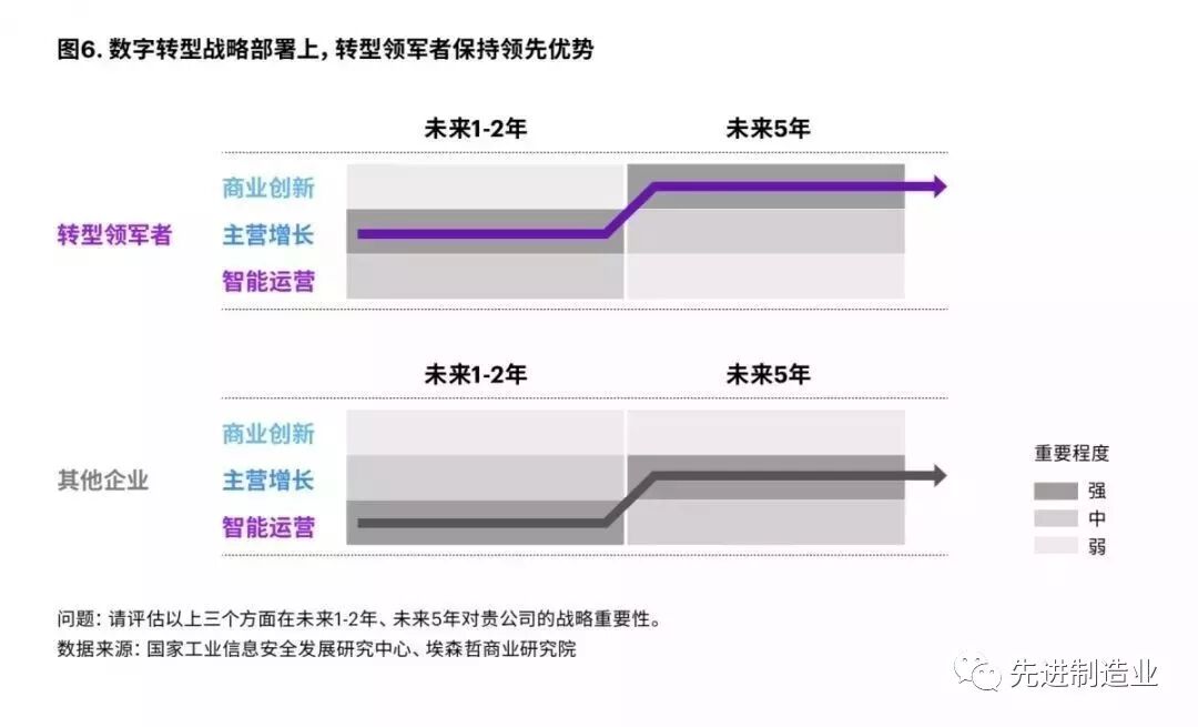 无论在短期还是长期,领军者都以业务的增长拓展为核心制定自己的数字转型战略;相比之下,其他企业则将数字转型作为修补工具,仍以“运营改善和优化”为主要目标。