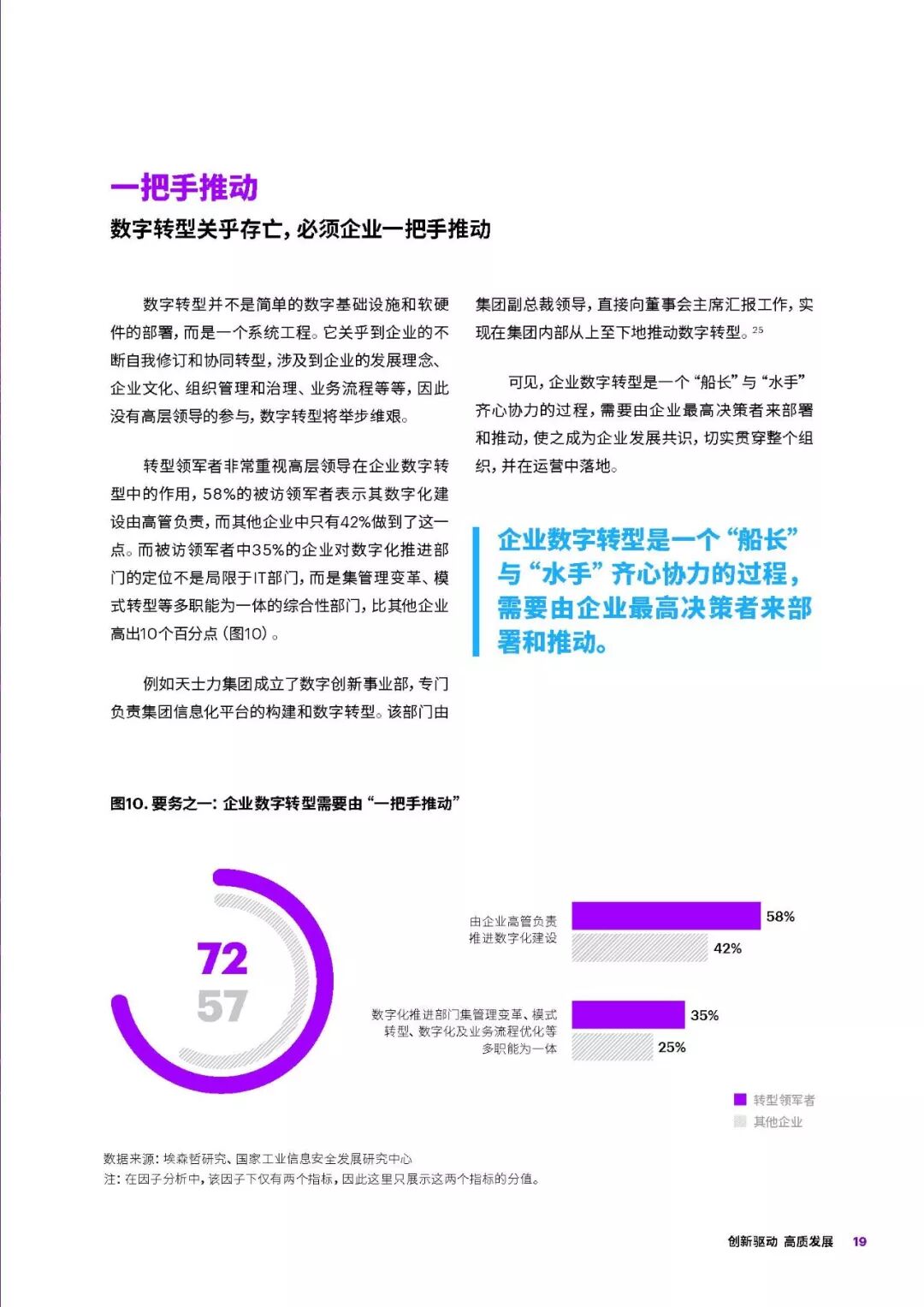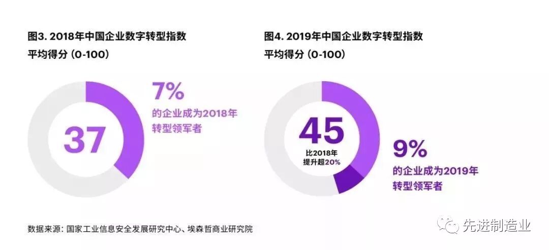 2019年埃森哲中国企业数字转型指数研究显示,一年来,中国企业数字转型正在全面推进,总体平均分数比2018年提升超20%;而领军者企业数量比例也有提升,2019年达到9%。