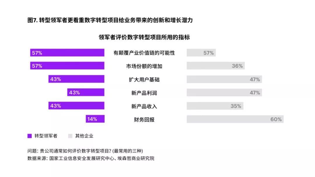 在评价数字转型项目的价值回报时,领军者更关注未来,看重项目给企业业务带来的行业颠覆性、创新性和增长潜力,而其他企业首要关注的是直接的财务回报。
