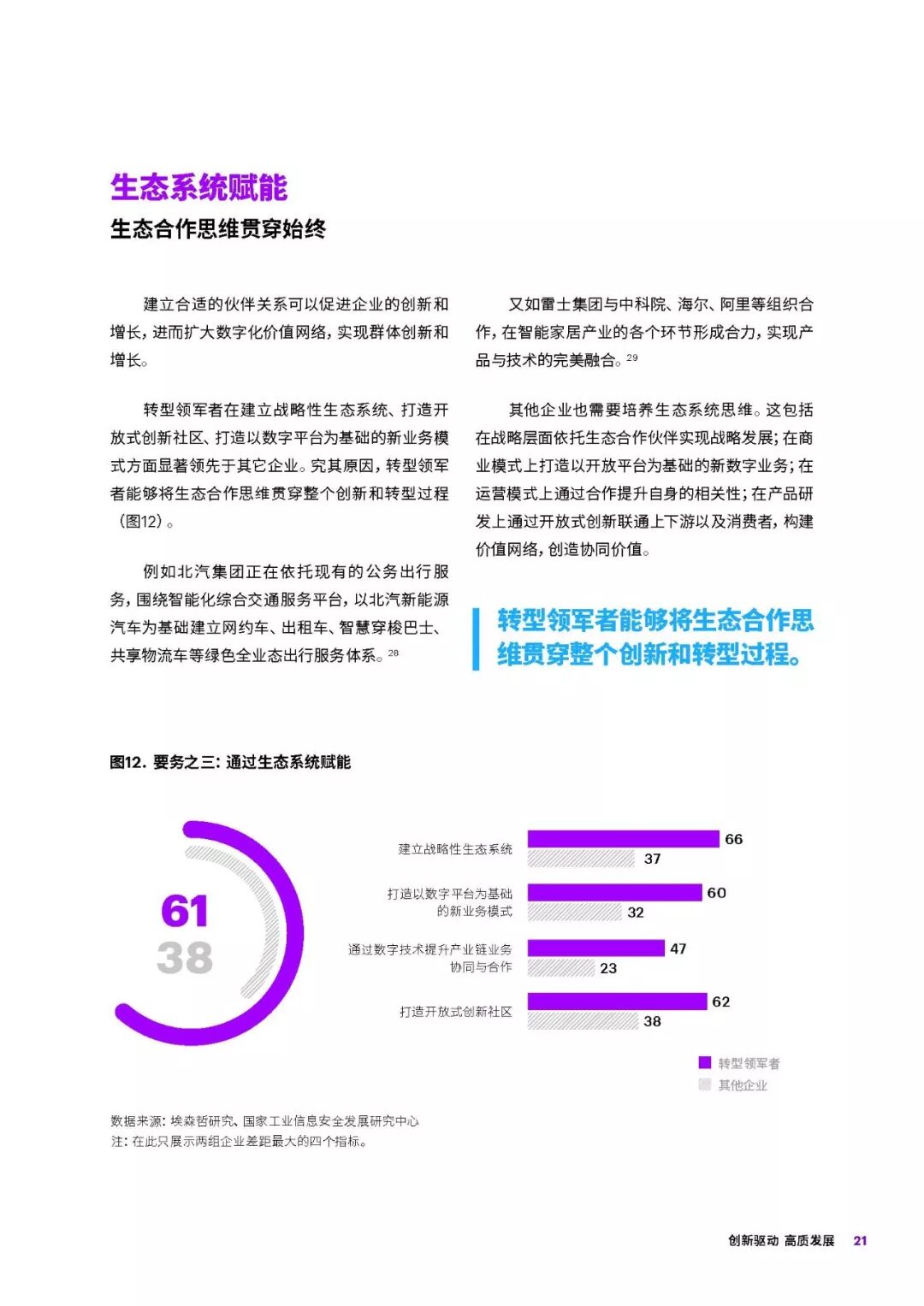 在革新思维下,领军者对数字转型的目标和要求不断深化和提高,在商业创新、主营增长、智能运营三大价值维度的具体实践上不断突破固有边界,大胆创新,将数字转型推至新高度:加速拓展数字生态系统,推动全业务转型。