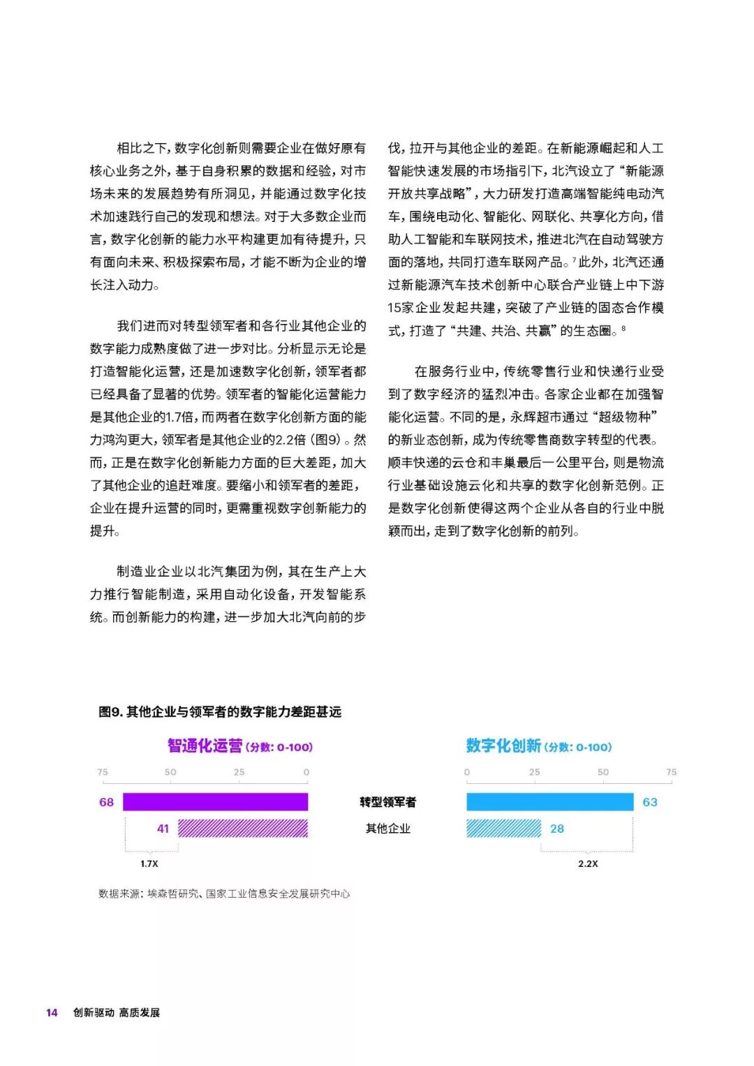 全生命周期的用户体验转型以及高扩展的智能运营领域领先倍数为2.2倍和2.4倍,在数字生态系统扩展,推动全业务转型创新上,这一优势已扩大到5.5倍。