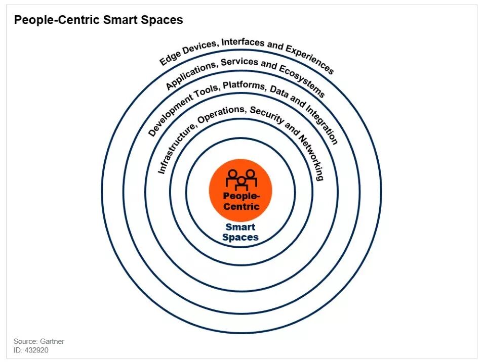 该报告还指出,任何智能技术、工具和解决方案都是以人为中心,无论多么优秀高效的工具都是为人服务;技术的应用趋势要以人员和组织为背景,而不是建立技术堆栈。企业在探索数字化转型时,首先必须考虑业务和人文环境的相结合,也称其为“以人为本的智能空间”。