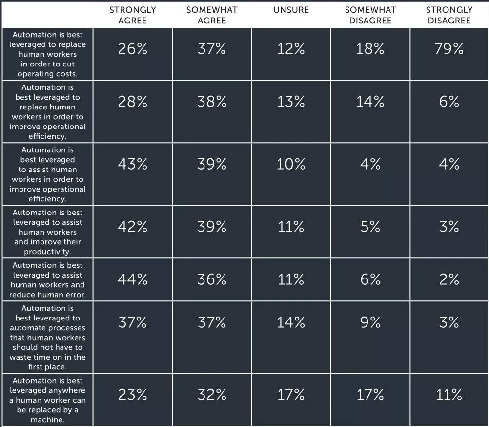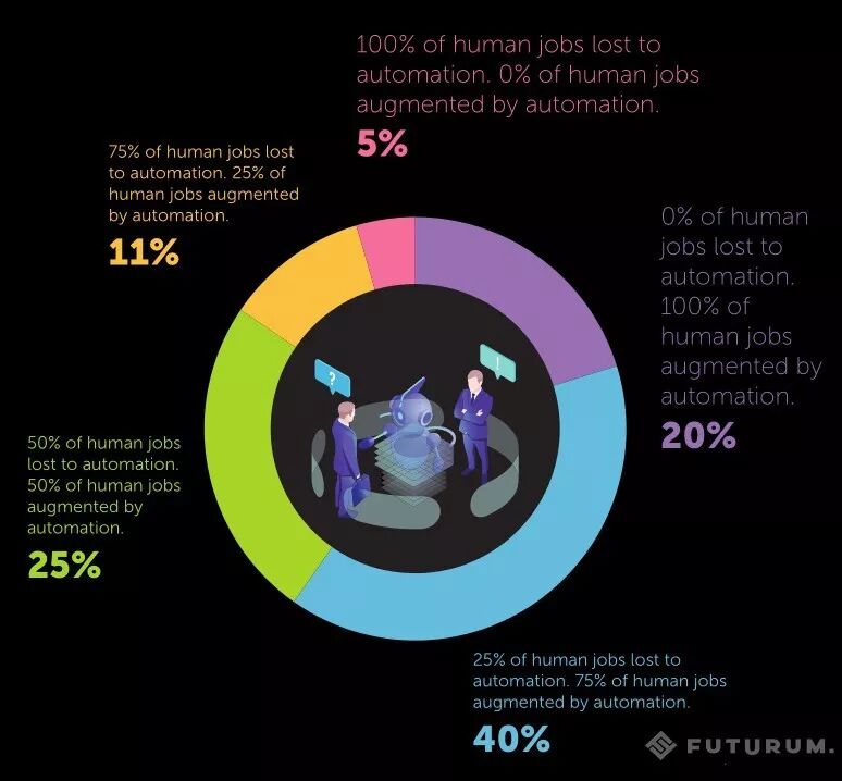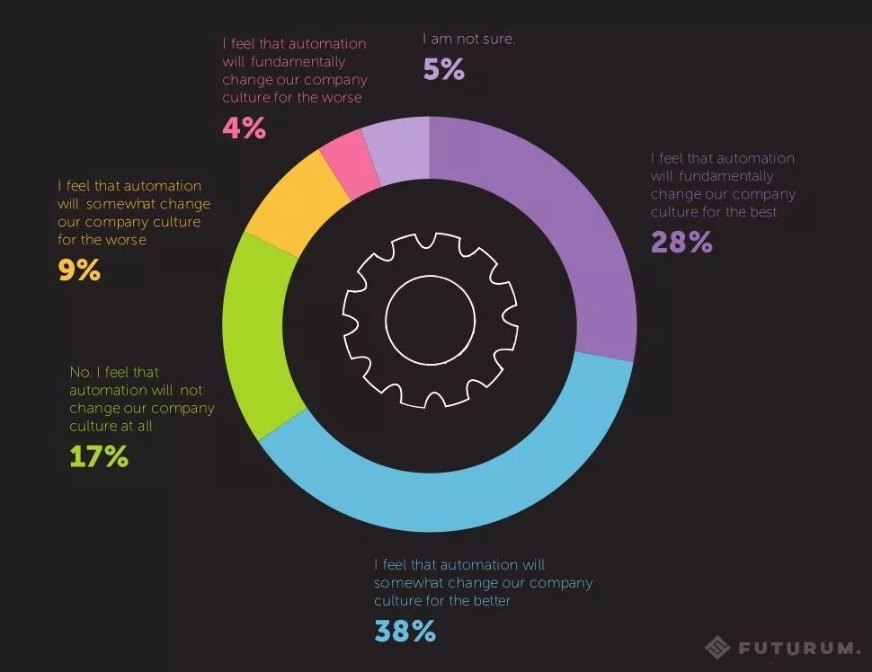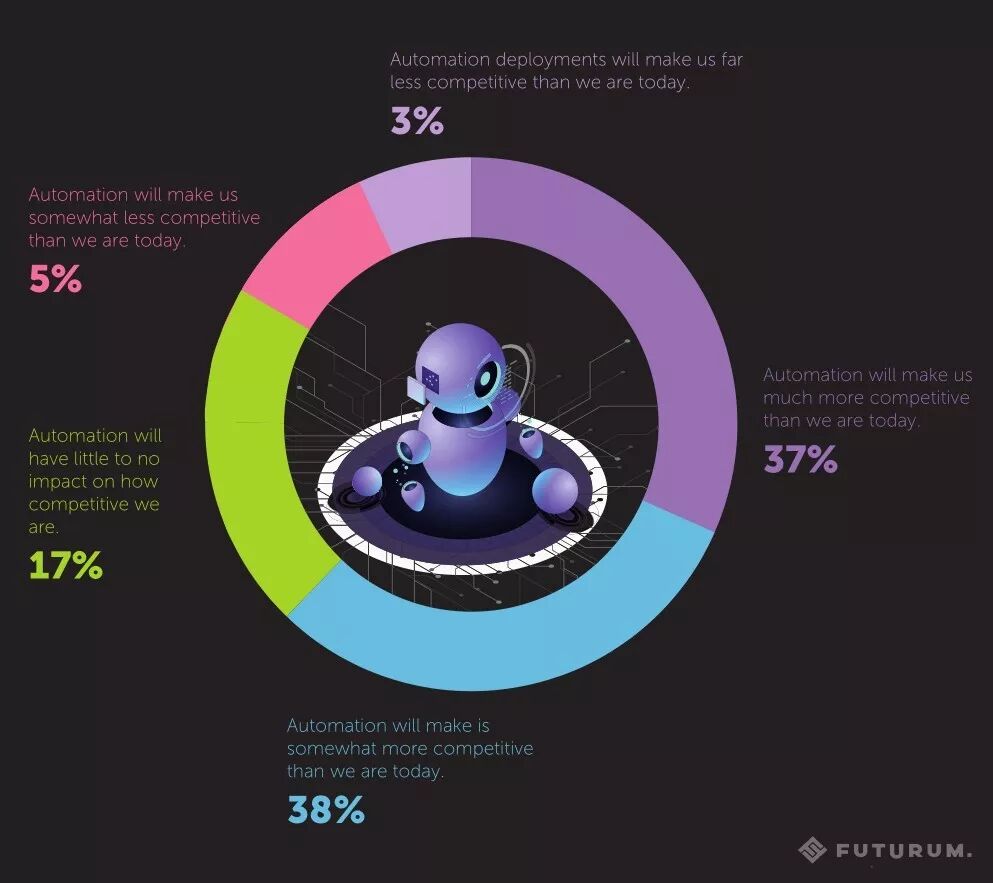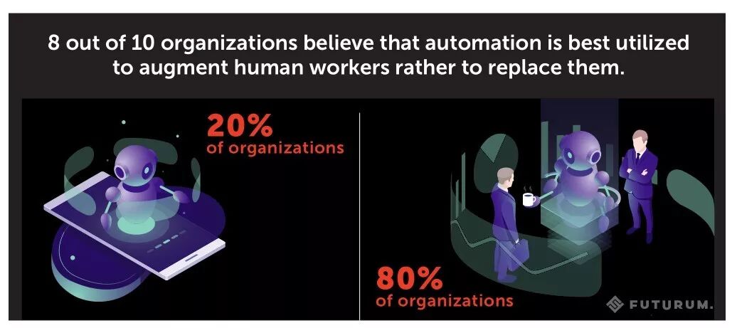 22%的企业表示:50%的员工将会因为RPA失业,50%的员工将因为RPA而增加工作机会; -
