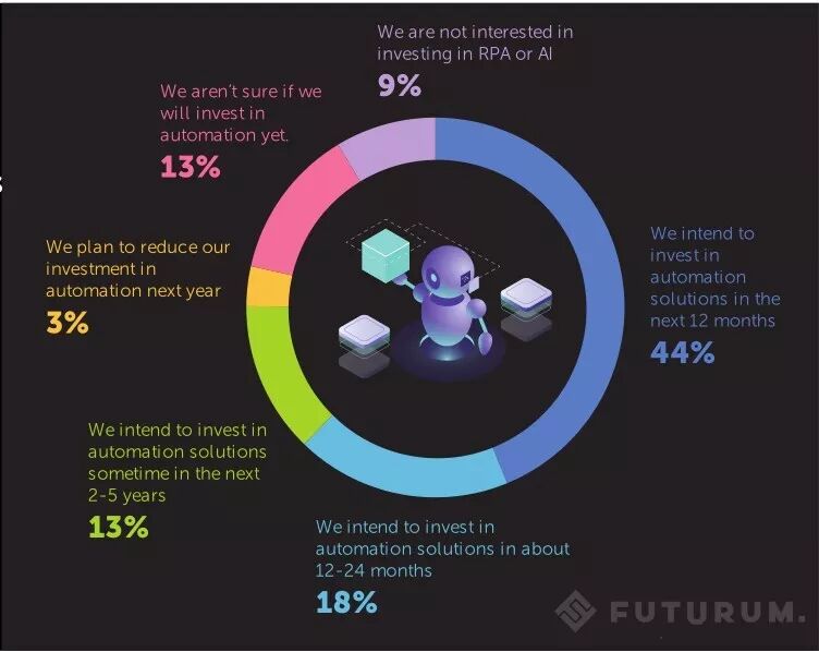 44%的企业表示在未来的1年内,加大对RPA的投资。