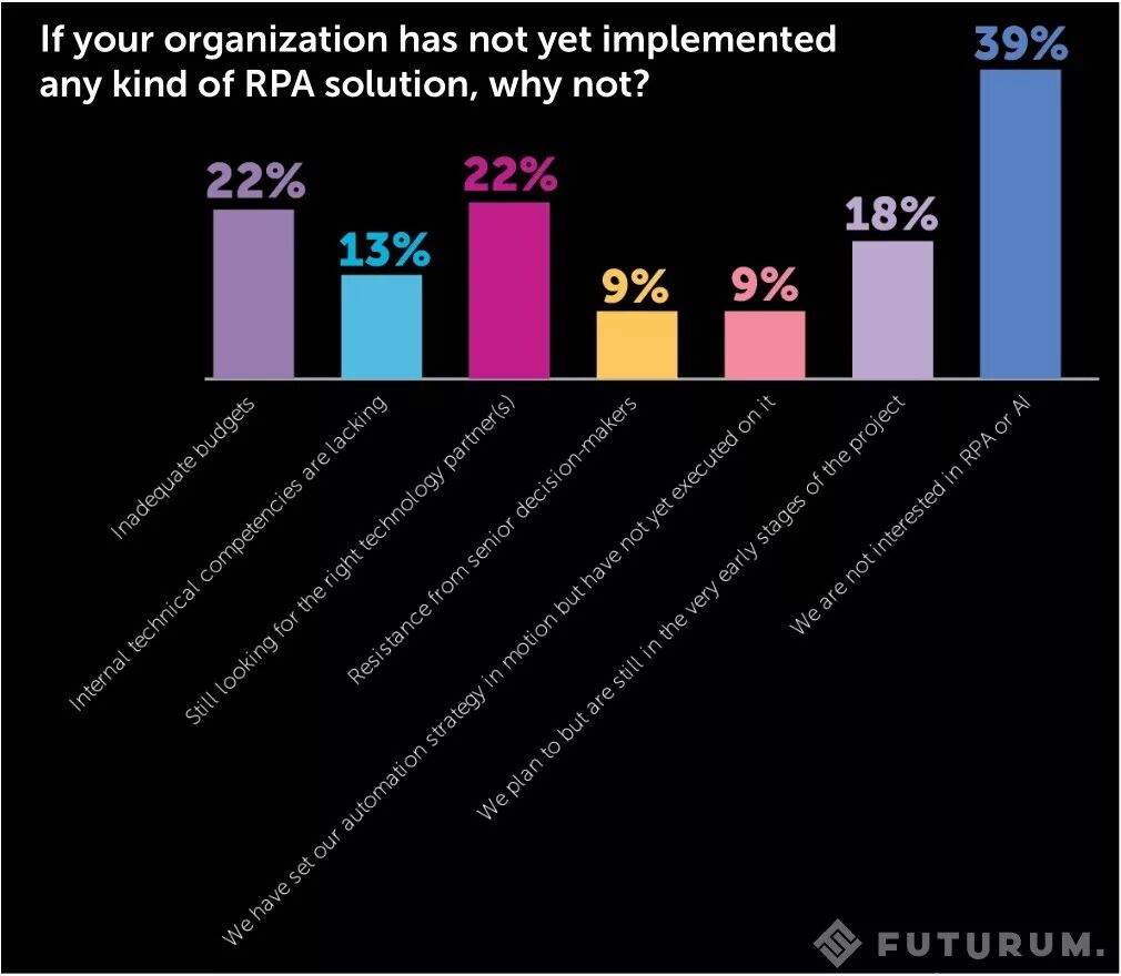 那些尚未应用与部署RPA的公司,多数是因为预算不足、缺少技术合作伙伴以及怀疑RPA创造价值的能力;