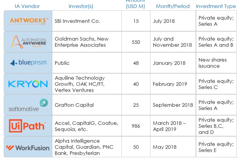 在过去18个月的时间里,各家RPA厂商受到了资本大量的投资,其中UiPath以9.86亿美元成为融资最多的有RPA企业,Automation Anywhere以5.55亿美元位列第二,WorkFusion以5000万美元位列第三,Blue Prism以4800万美元位列第四,Kryon以4000万美元位列第五。