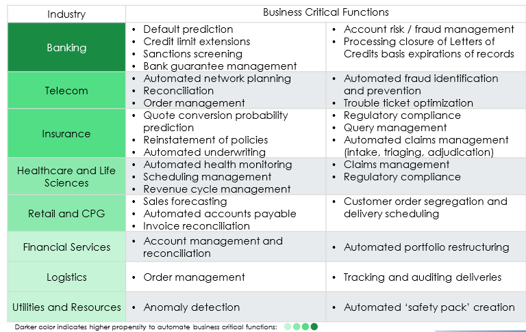 在银行业中,应用IPA最多的流程为信用额度提升、黑名单管理、担保管理、欺诈管理等; 在电信行业中,应用IPA最多的流程为订单管理、自动欺诈识别、故障排除、网络规划等; 在保险行业中,应用IPA最多的流程为业务查询、自动索赔、自动入保、合规检测等。