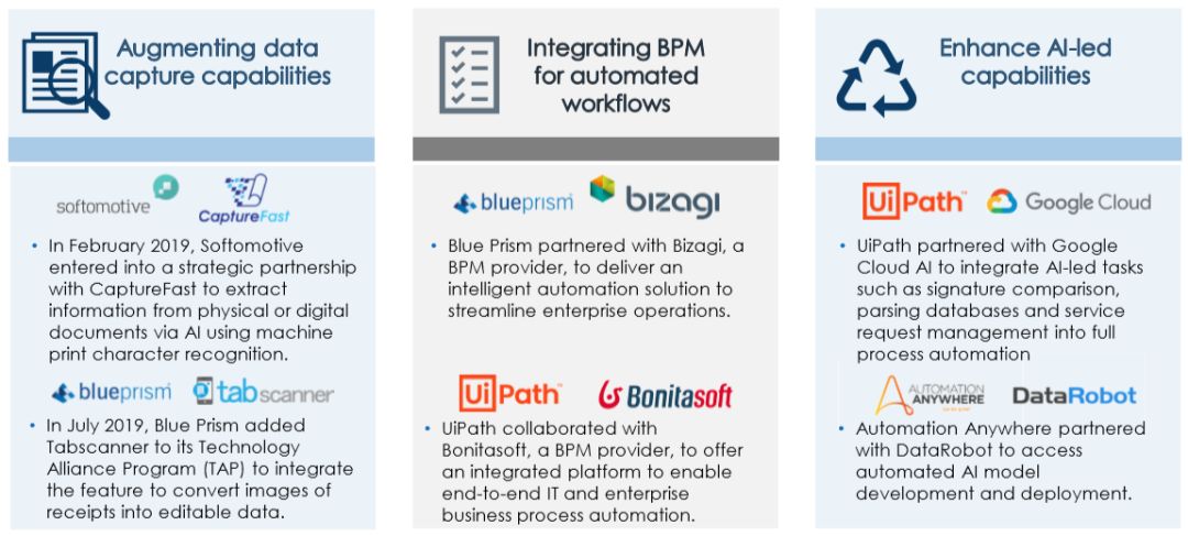 为了提高RPA技术创新的进程与自动化范围,部分厂商分别与不同的BPM和AI供应商进行合作 ,如Automation Anywhere与ADT、DataRobot进行合作;UiPath与Google Cloud、Techmahindra进行合作; Blue Prism与ddls、Bizagi进行合作等等。