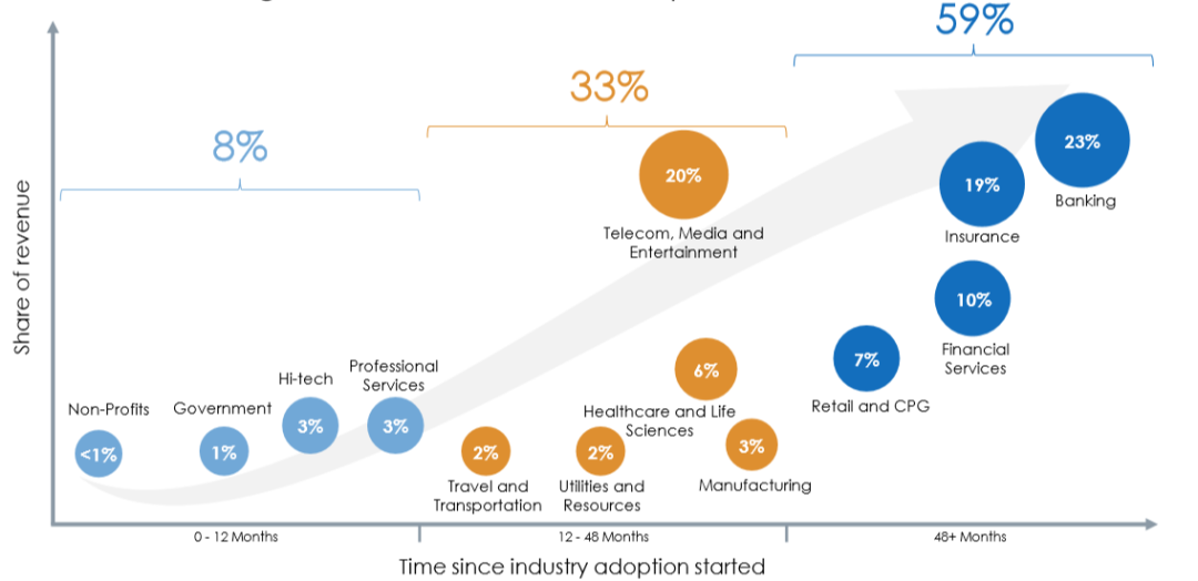 各行业已经体验到应用IPA的全方位好处,银行业以23%的份额成为应用最多的行业,电信、娱乐和媒体行业20%位居第二位,保险和金融服务分别以19%、10%位列三四位。 而非营利组织以小于1%成为应用最少的行业。 在IPA应用时间方面,公共领域少于12个月,电信和娱乐行业在12—48个月之间,而银行金融业大于48个月成为应用时间最久的行业。