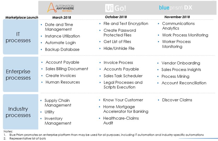 为了提高用户在RPA流程中使用AI的效率,Automation Anywhere、UiPath、Blue Prism三家RPA服务商分别推出了Bot Store、Ui Go、Blue PrismDX三个智能机器人商店。 预设智能机器人模板高达1200多个,提供数据备份、获取文件列表、文本提取等智能机器人流程。