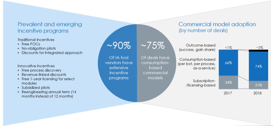 智能自动化正被大量用于更复杂和人性化业务,如:风险分析、欺诈检测、实时对账、响应模拟等。应用IPA较多的行业是银行、保险、电信、制造、零售以及医疗保健等。AI技术已经成为RPA厂商之间竞争的重要元素,同时为了提高客户获取效率,厂商开始提供一些无偿服务,如免费PoC、扩展试用和免费部署实施等。